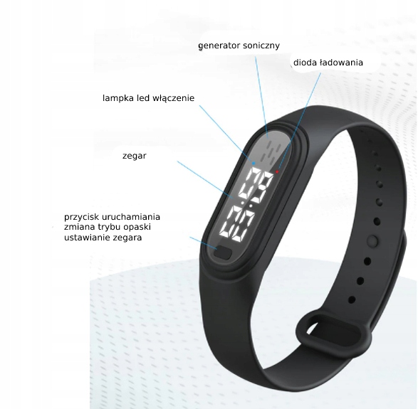 - wyświetlacz LED – wyświetla godzinę oraz jeden z trzech poziomów nasilenia ultradźwięków